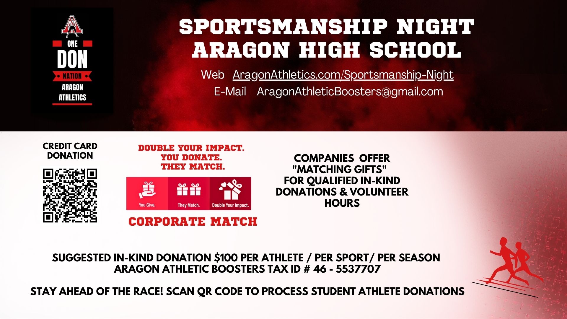 PRO TIP: Save time, and beat the line at Sportsmanship Night by submitting your athlete's in-kind donation via the top link in advance. Thank you for maintaining current student athletic clearance records in our portal. Wishing all our DONS a safe and amazing season!GO THE EXTRA YARD! Don't leave money on the field! We encourage you to MATCH your in-kind donation through your employer's corporate match giving portal. Be the change maker and fund beyond the suggested amount to support ALL DONS athletes, sports, teams and the entire Aragon Athletic community.